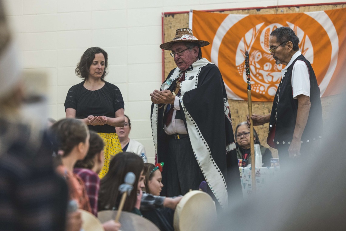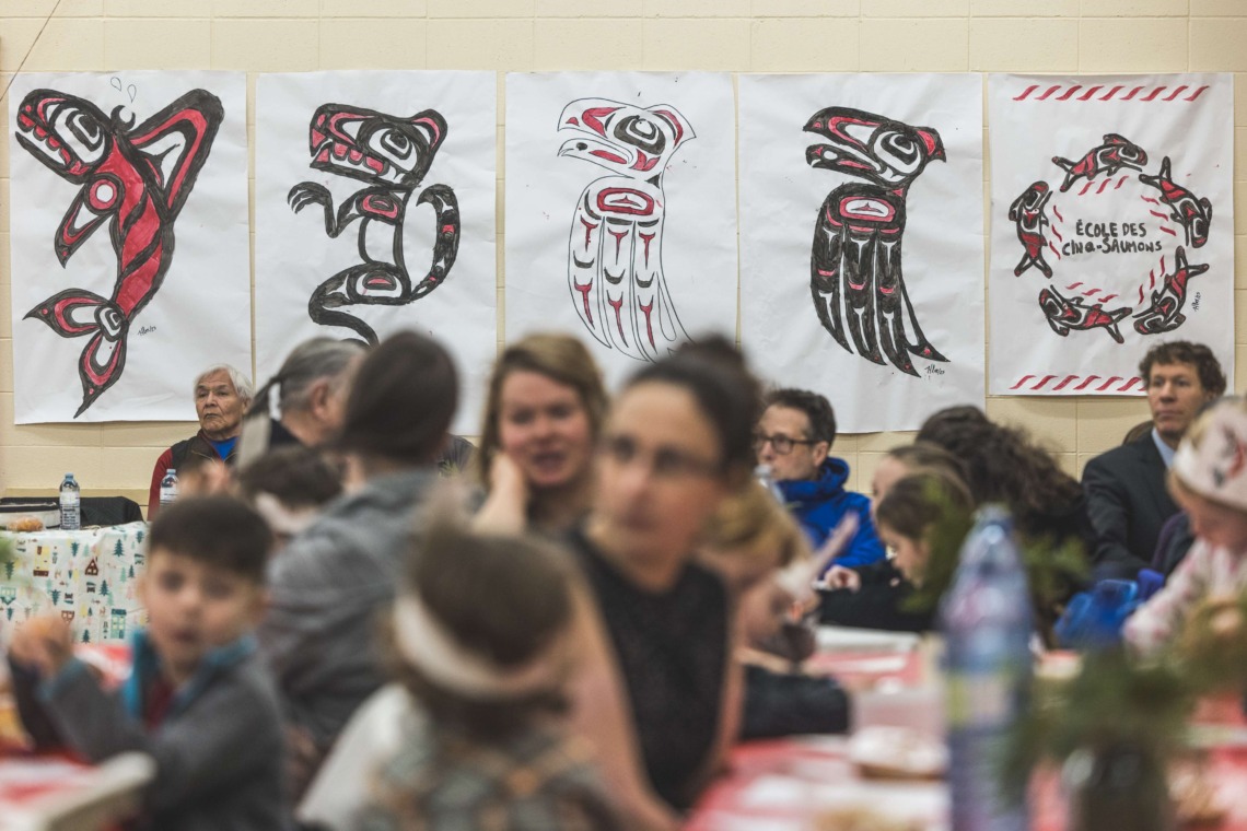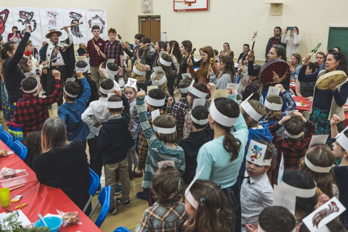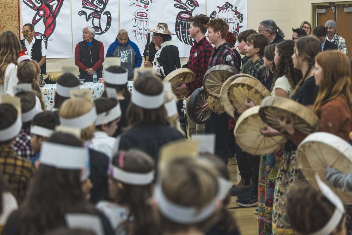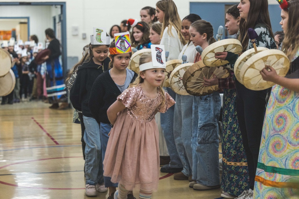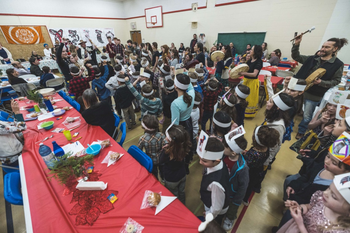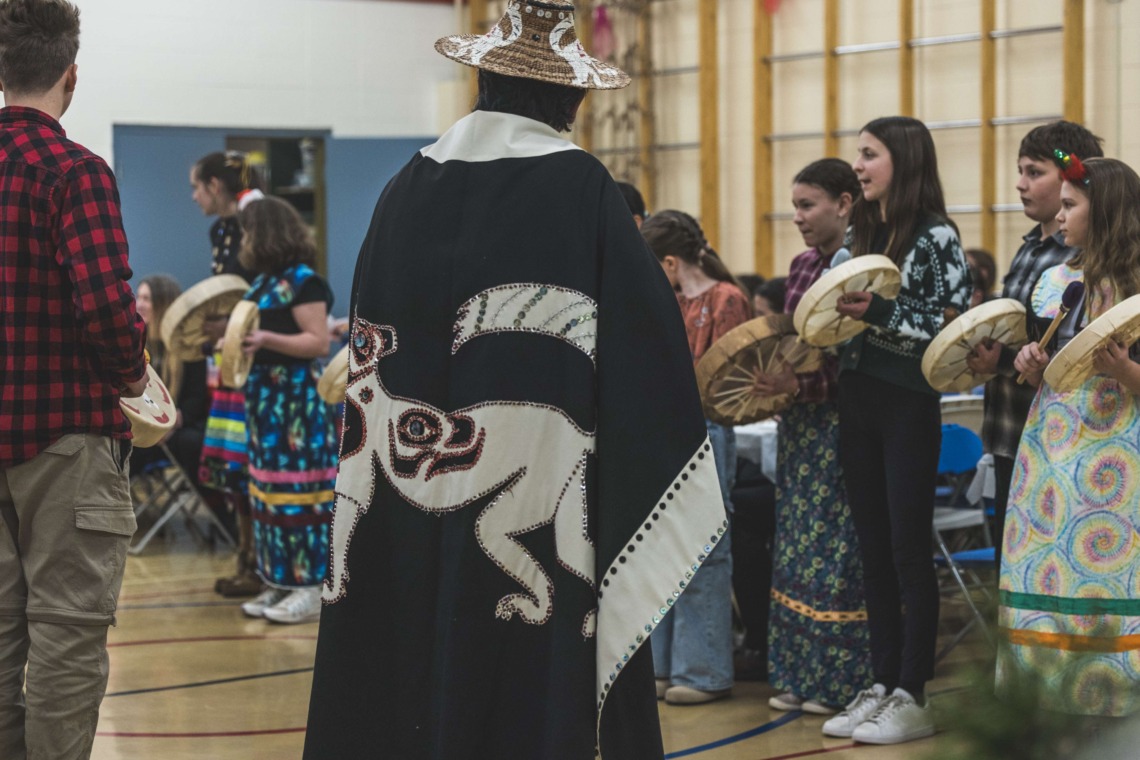 Le 11 décembre dernier, ce fut un grand honneur de recréer les traditions d’un festin et d’une cérémonie de nom d’école selon les enseignements traditionnels tsimshian dans le gymnase de l’école des Cinq-saumons. David Wells nous a généreusement accompagné dans nos apprentissages, partageant son savoir et sa culture avec notre communauté. Sa participation a été possible grâce au soutien de Angela Genaille et de son équipe de Kermode Friendship Society. Carmen Morrison a aussi apporté son soutien aux élèves dans plusieurs étapes de préparation, de la fabrication de projets d’art traditionnels en passant par l’apprentissage de chansons et la pratique de protocoles liés au déroulement d’un festin. Louisa Gray et Mary Genaille nous ont permis d’apprendre à préparer un Nisga’a stew et du pain frit. Cette célébration restera gravée dans nos coeurs comme un moment unique de partage, de connexion et d’amour. T’oyaxsut nüüsm à tous ceux qui ont contribué à cet événement; aux invités d’honneur, aux parents, aux familles, aux cuisinières, aux élèves, aux amis et aux partenaires. Merci aussi à Yan Kaczynski, photographe, pour toutes les magnifiques photos! Nous sommes honorés de dire que l’école des Cinq-saumons est maintenant Xstuunsa Hoon’m Suwilaawksat dans la langue Sm’Algyax!