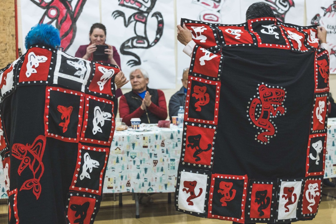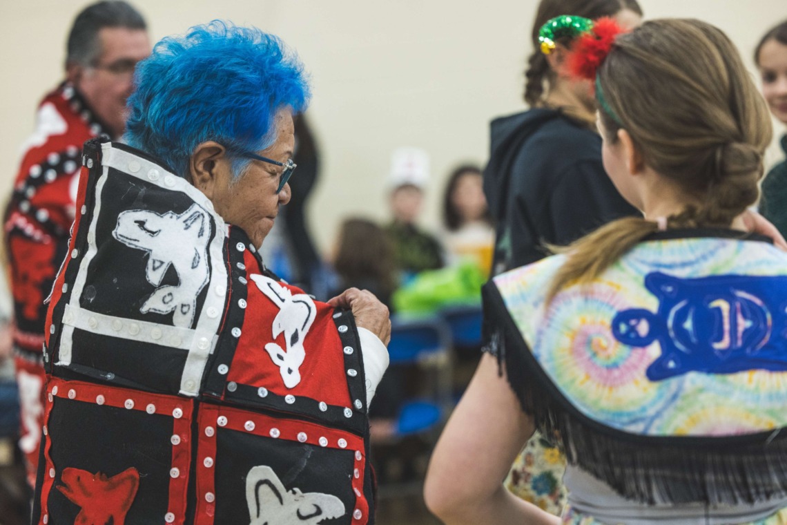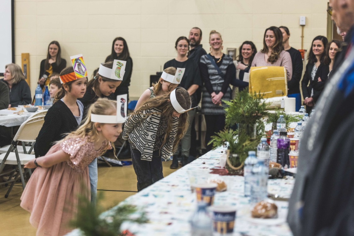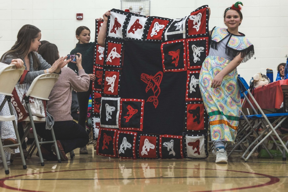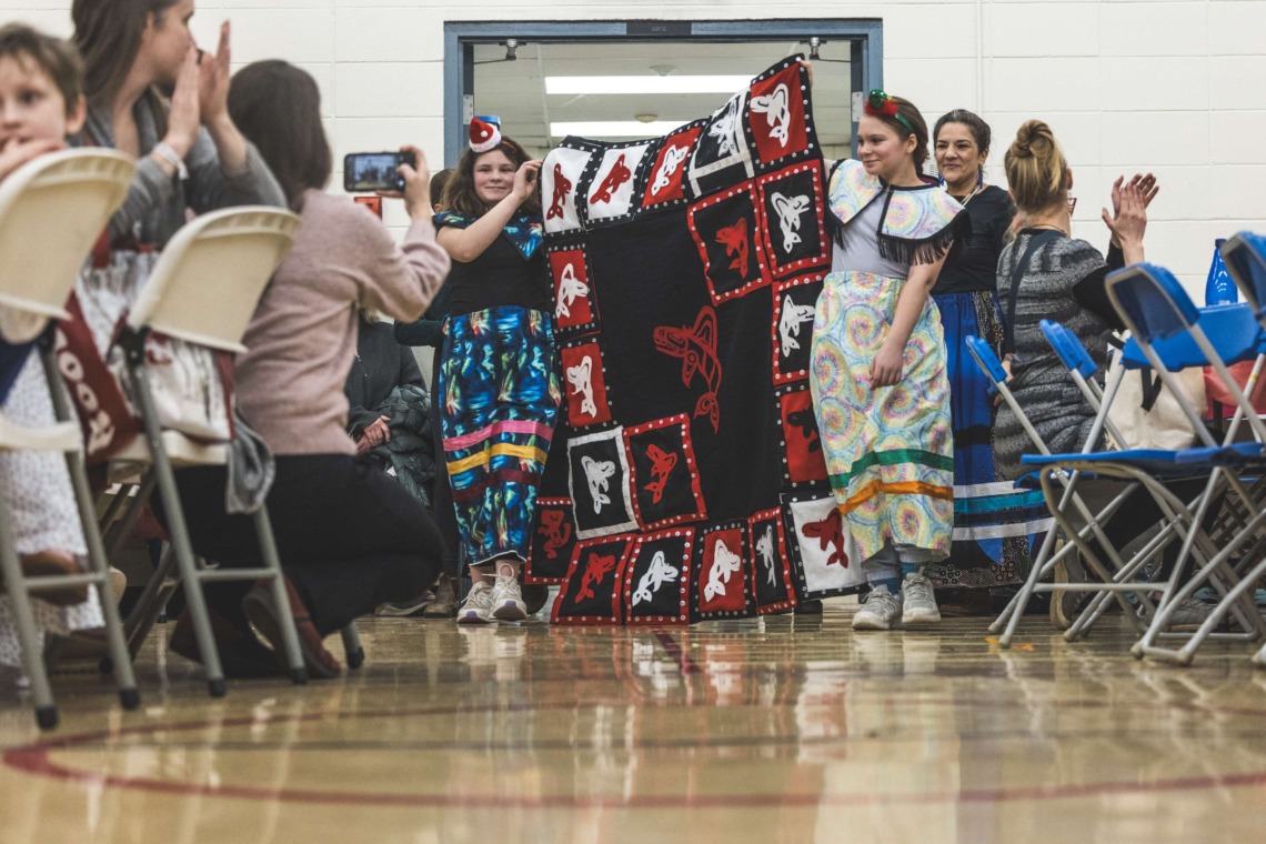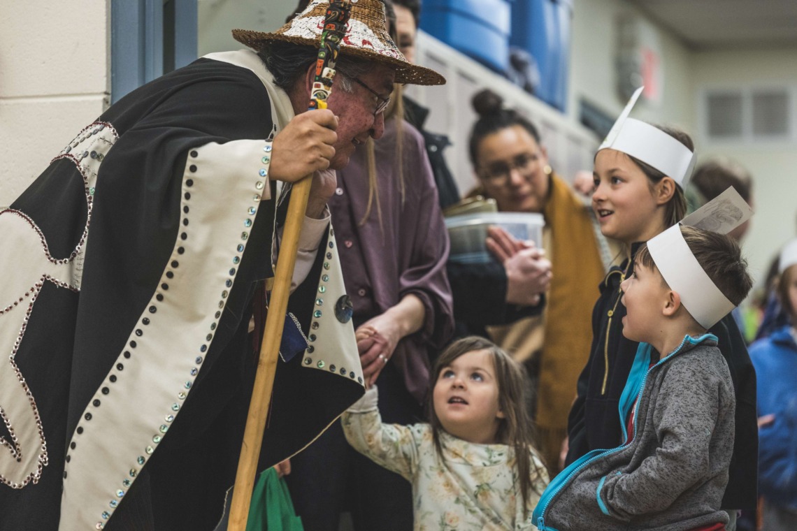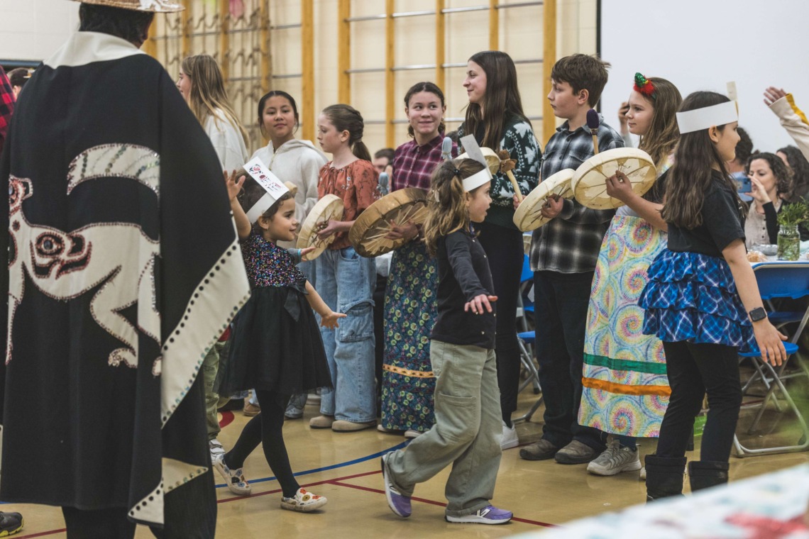 Le 11 décembre dernier, ce fut un grand honneur de recréer les traditions d’un festin et d’une cérémonie de nom d’école selon les enseignements traditionnels tsimshian dans le gymnase de l’école des Cinq-saumons. David Wells nous a généreusement accompagné dans nos apprentissages, partageant son savoir et sa culture avec notre communauté. Sa participation a été possible grâce au soutien de Angela Genaille et de son équipe de Kermode Friendship Society. Carmen Morrison a aussi apporté son soutien aux élèves dans plusieurs étapes de préparation, de la fabrication de projets d’art traditionnels en passant par l’apprentissage de chansons et la pratique de protocoles liés au déroulement d’un festin. Louisa Gray et Mary Genaille nous ont permis d’apprendre à préparer un Nisga’a stew et du pain frit. Cette célébration restera gravée dans nos coeurs comme un moment unique de partage, de connexion et d’amour. T’oyaxsut nüüsm à tous ceux qui ont contribué à cet événement; aux invités d’honneur, aux parents, aux familles, aux cuisinières, aux élèves, aux amis et aux partenaires. Merci aussi à Yan Kaczynski, photographe, pour toutes les magnifiques photos! Nous sommes honorés de dire que l’école des Cinq-saumons est maintenant Xstuunsa Hoon’m Suwilaawksat dans la langue Sm’Algyax!