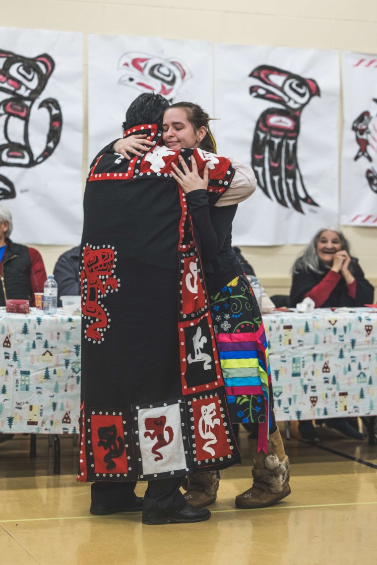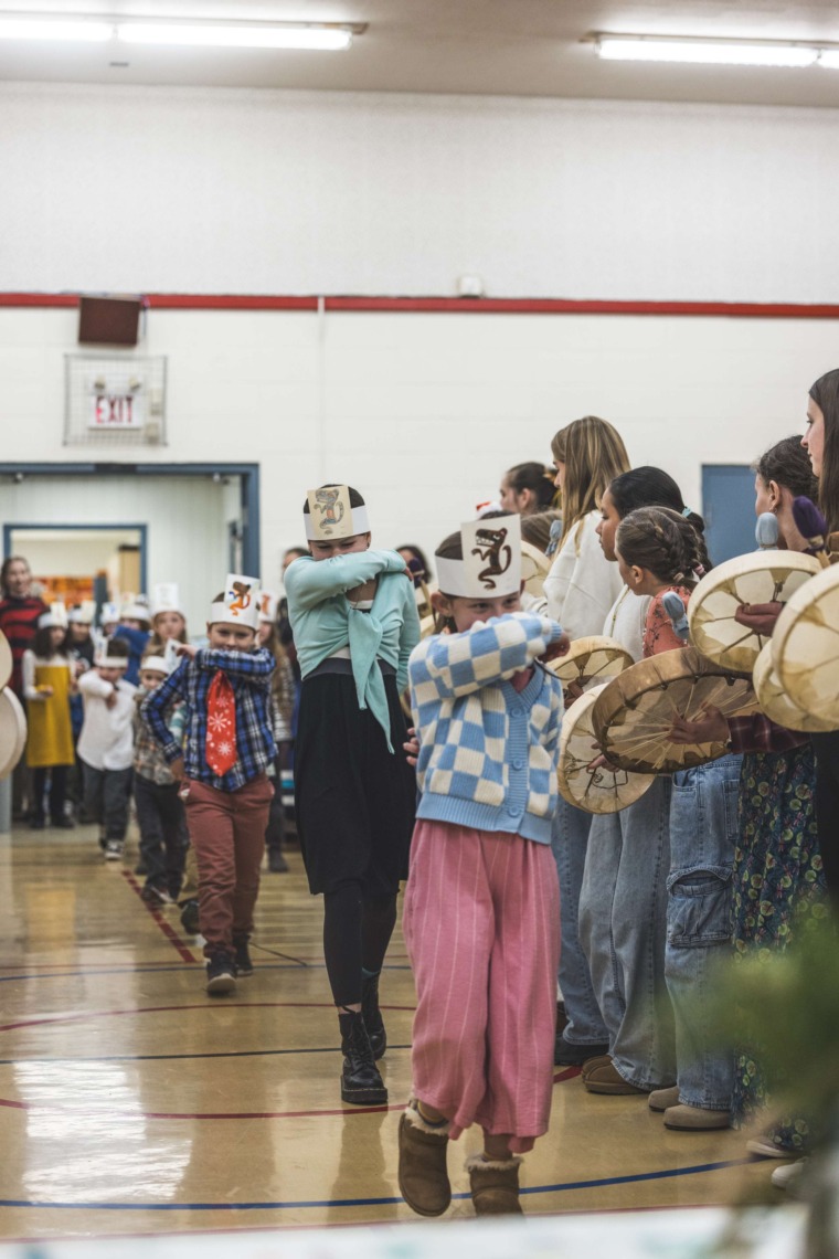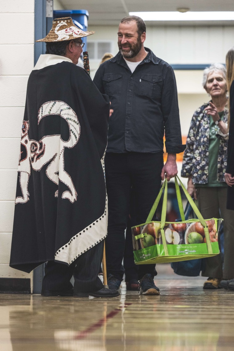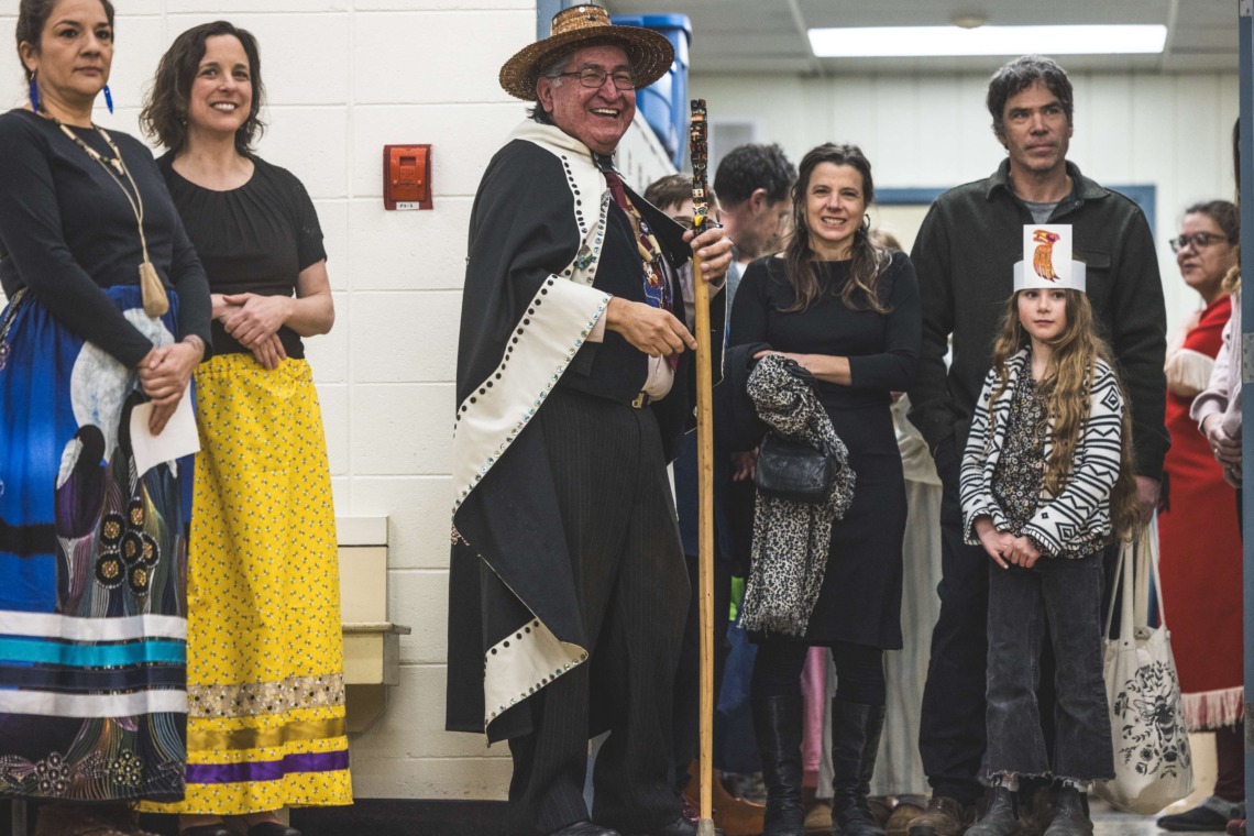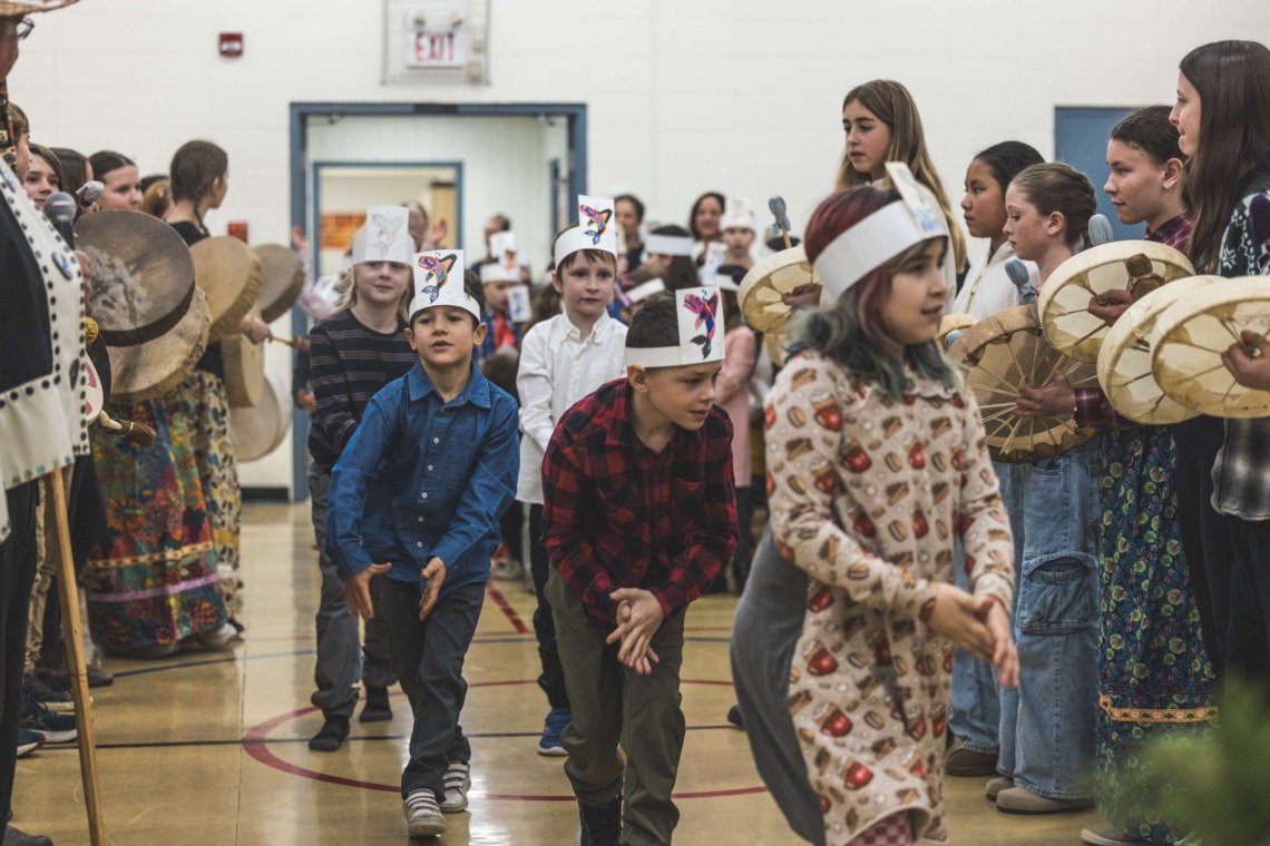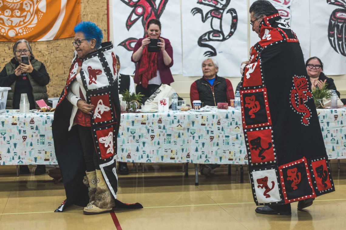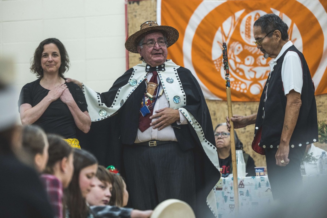 Le 11 décembre dernier, ce fut un grand honneur de recréer les traditions d’un festin et d’une cérémonie de nom d’école selon les enseignements traditionnels tsimshian dans le gymnase de l’école des Cinq-saumons. David Wells nous a généreusement accompagné dans nos apprentissages, partageant son savoir et sa culture avec notre communauté. Sa participation a été possible grâce au soutien de Angela Genaille et de son équipe de Kermode Friendship Society. Carmen Morrison a aussi apporté son soutien aux élèves dans plusieurs étapes de préparation, de la fabrication de projets d’art traditionnels en passant par l’apprentissage de chansons et la pratique de protocoles liés au déroulement d’un festin. Louisa Gray et Mary Genaille nous ont permis d’apprendre à préparer un Nisga’a stew et du pain frit. Cette célébration restera gravée dans nos coeurs comme un moment unique de partage, de connexion et d’amour. T’oyaxsut nüüsm à tous ceux qui ont contribué à cet événement; aux invités d’honneur, aux parents, aux familles, aux cuisinières, aux élèves, aux amis et aux partenaires. Merci aussi à Yan Kaczynski, photographe, pour toutes les magnifiques photos! Nous sommes honorés de dire que l’école des Cinq-saumons est maintenant Xstuunsa Hoon’m Suwilaawksat dans la langue Sm’Algyax!