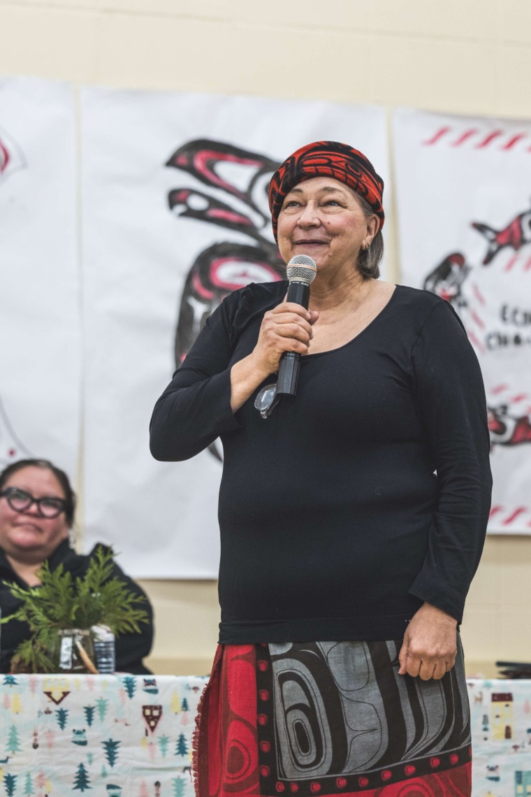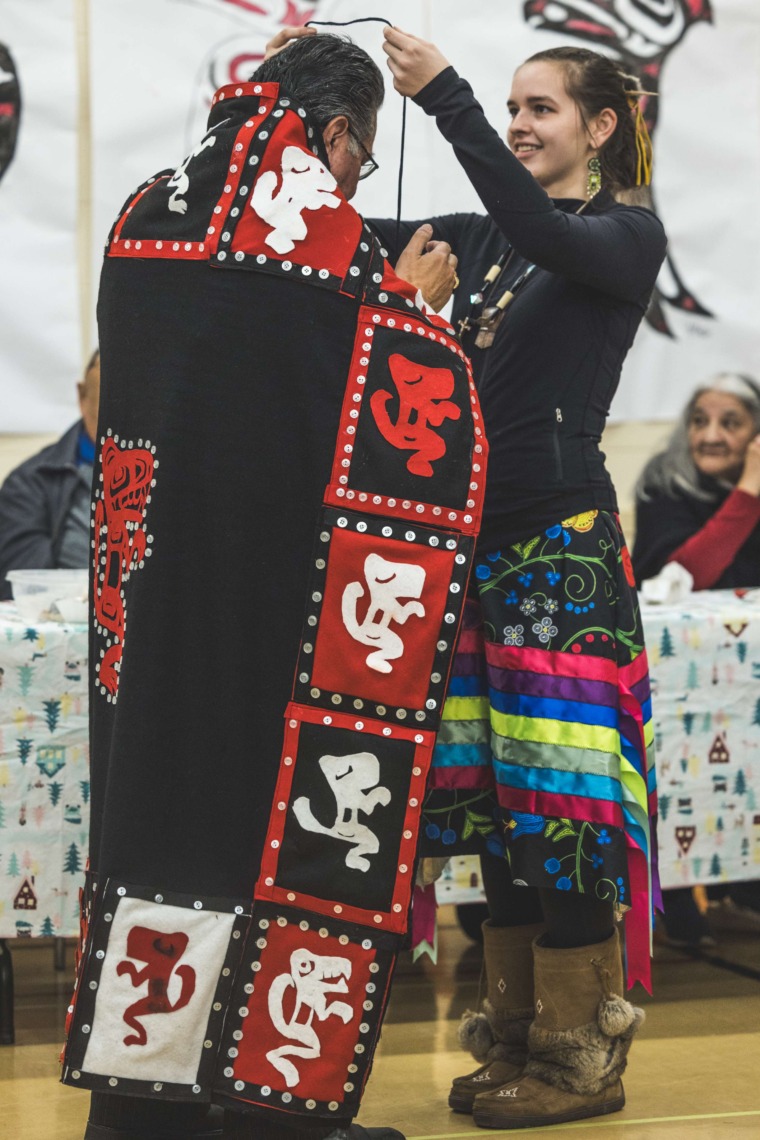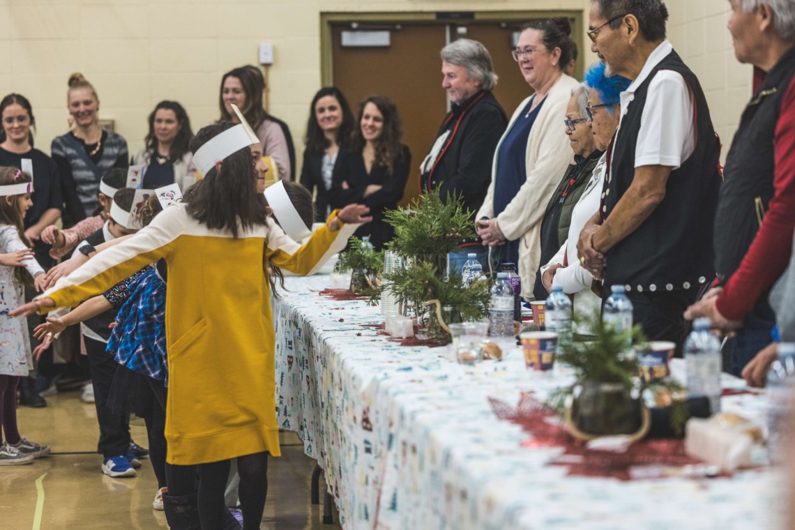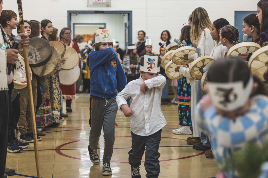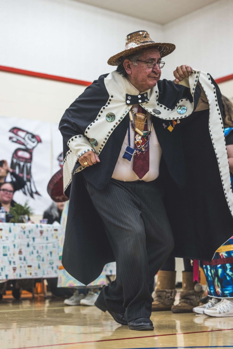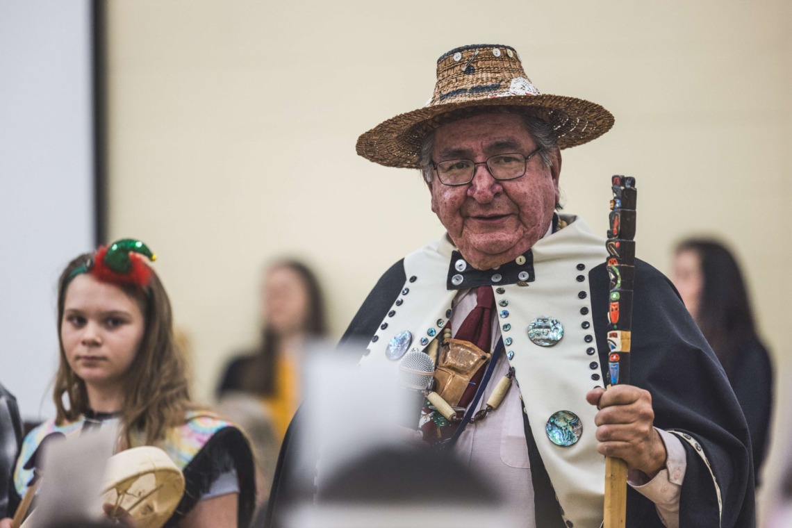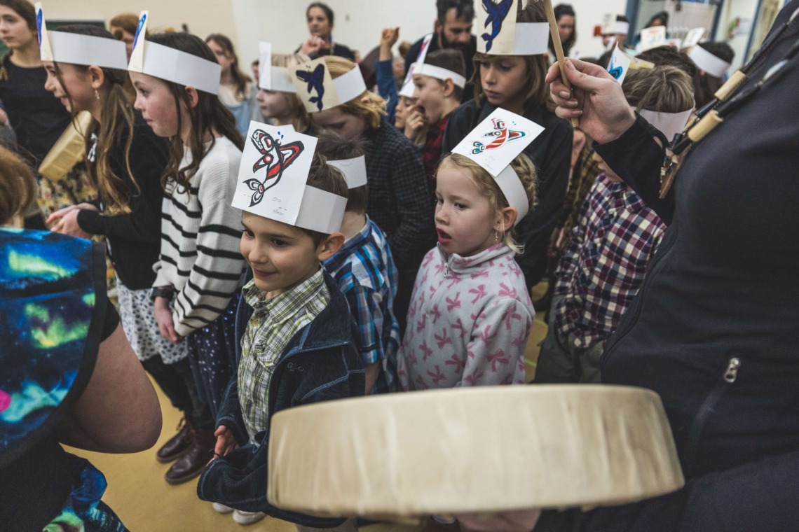 Le 11 décembre dernier, ce fut un grand honneur de recréer les traditions d’un festin et d’une cérémonie de nom d’école selon les enseignements traditionnels tsimshian dans le gymnase de l’école des Cinq-saumons. David Wells nous a généreusement accompagné dans nos apprentissages, partageant son savoir et sa culture avec notre communauté. Sa participation a été possible grâce au soutien de Angela Genaille et de son équipe de Kermode Friendship Society. Carmen Morrison a aussi apporté son soutien aux élèves dans plusieurs étapes de préparation, de la fabrication de projets d’art traditionnels en passant par l’apprentissage de chansons et la pratique de protocoles liés au déroulement d’un festin. Louisa Gray et Mary Genaille nous ont permis d’apprendre à préparer un Nisga’a stew et du pain frit. Cette célébration restera gravée dans nos coeurs comme un moment unique de partage, de connexion et d’amour. T’oyaxsut nüüsm à tous ceux qui ont contribué à cet événement; aux invités d’honneur, aux parents, aux familles, aux cuisinières, aux élèves, aux amis et aux partenaires. Merci aussi à Yan Kaczynski, photographe, pour toutes les magnifiques photos! Nous sommes honorés de dire que l’école des Cinq-saumons est maintenant Xstuunsa Hoon’m Suwilaawksat dans la langue Sm’Algyax!