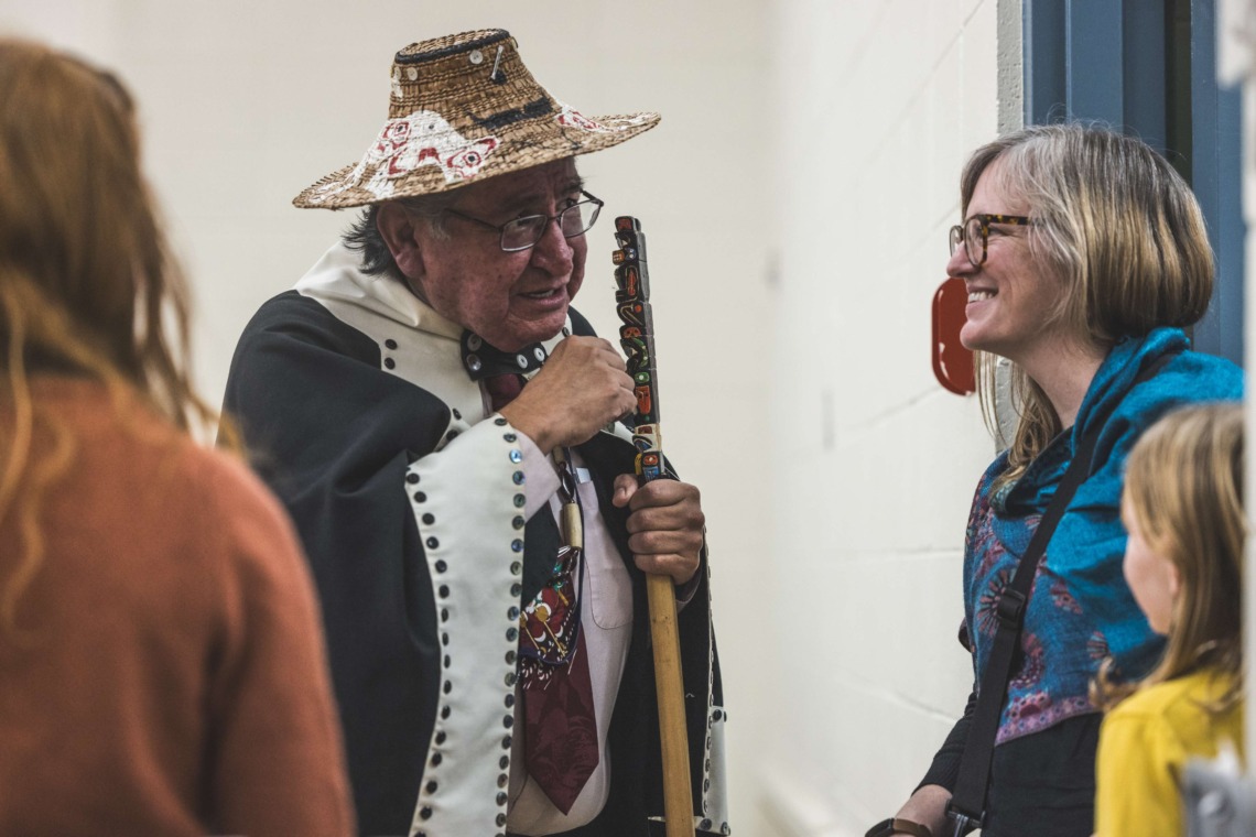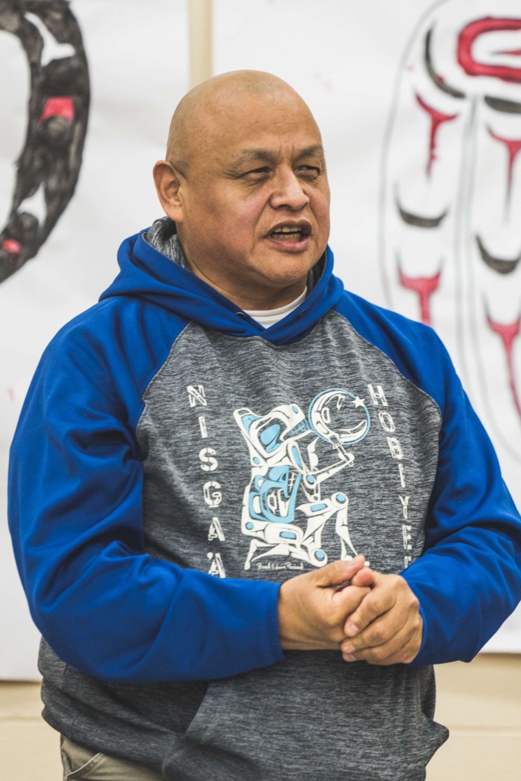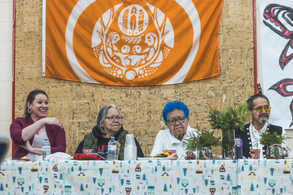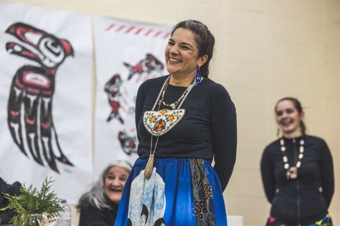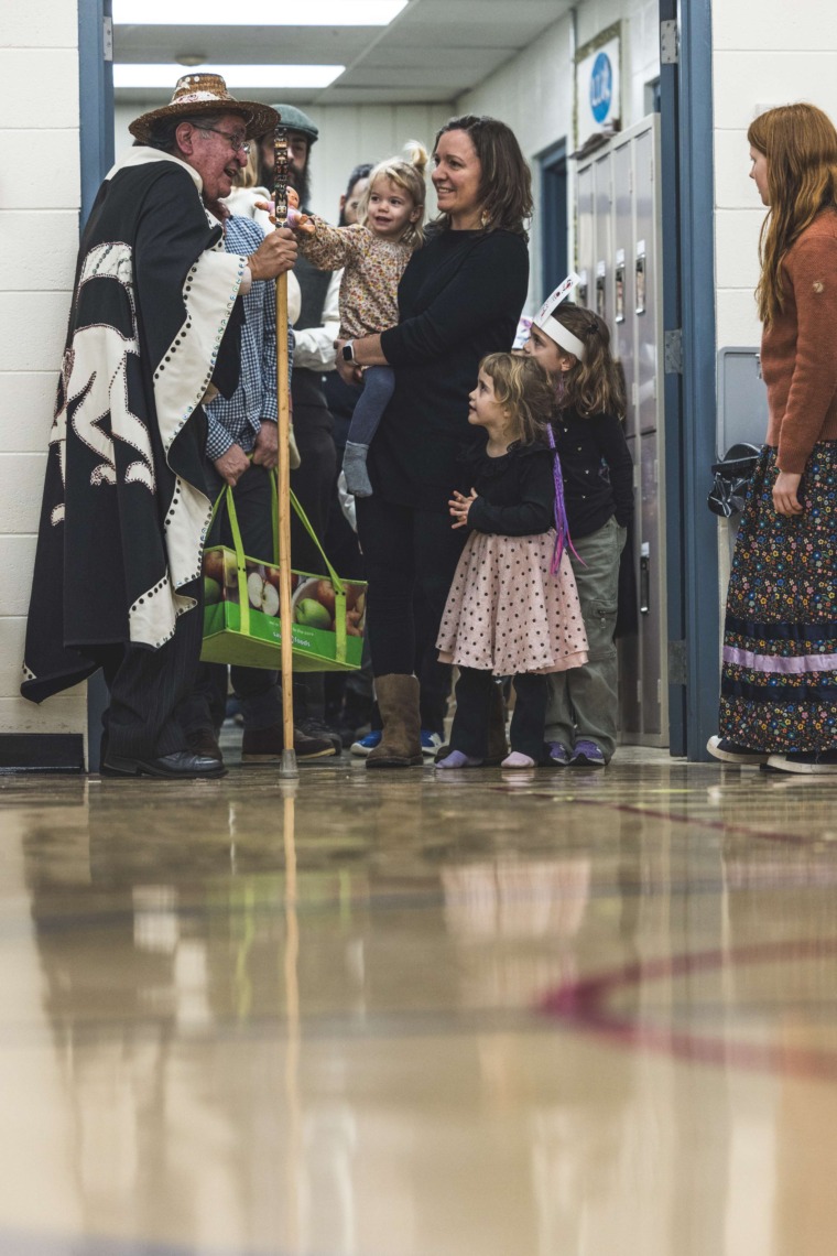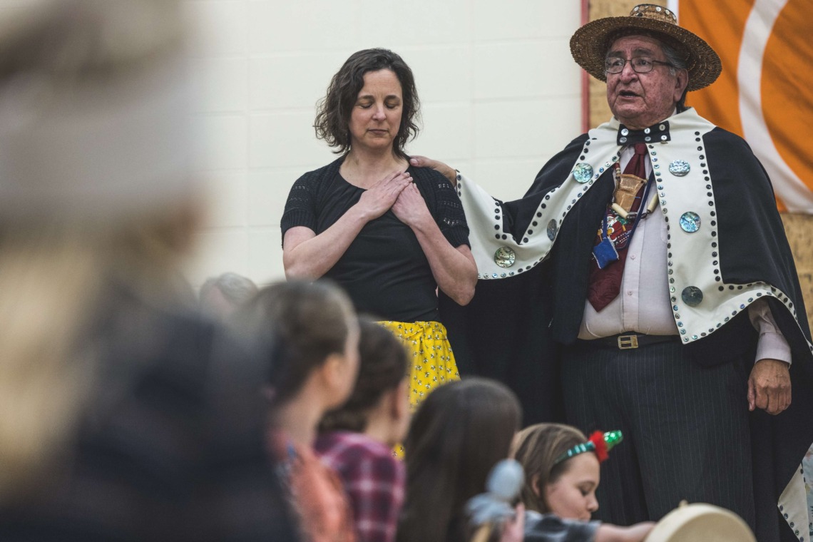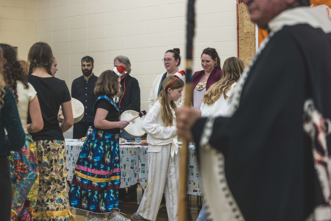 Le 11 décembre dernier, ce fut un grand honneur de recréer les traditions d’un festin et d’une cérémonie de nom d’école selon les enseignements traditionnels tsimshian dans le gymnase de l’école des Cinq-saumons. David Wells nous a généreusement accompagné dans nos apprentissages, partageant son savoir et sa culture avec notre communauté. Sa participation a été possible grâce au soutien de Angela Genaille et de son équipe de Kermode Friendship Society. Carmen Morrison a aussi apporté son soutien aux élèves dans plusieurs étapes de préparation, de la fabrication de projets d’art traditionnels en passant par l’apprentissage de chansons et la pratique de protocoles liés au déroulement d’un festin. Louisa Gray et Mary Genaille nous ont permis d’apprendre à préparer un Nisga’a stew et du pain frit. Cette célébration restera gravée dans nos coeurs comme un moment unique de partage, de connexion et d’amour. T’oyaxsut nüüsm à tous ceux qui ont contribué à cet événement; aux invités d’honneur, aux parents, aux familles, aux cuisinières, aux élèves, aux amis et aux partenaires. Merci aussi à Yan Kaczynski, photographe, pour toutes les magnifiques photos! Nous sommes honorés de dire que l’école des Cinq-saumons est maintenant Xstuunsa Hoon’m Suwilaawksat dans la langue Sm’Algyax!