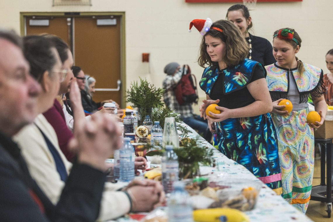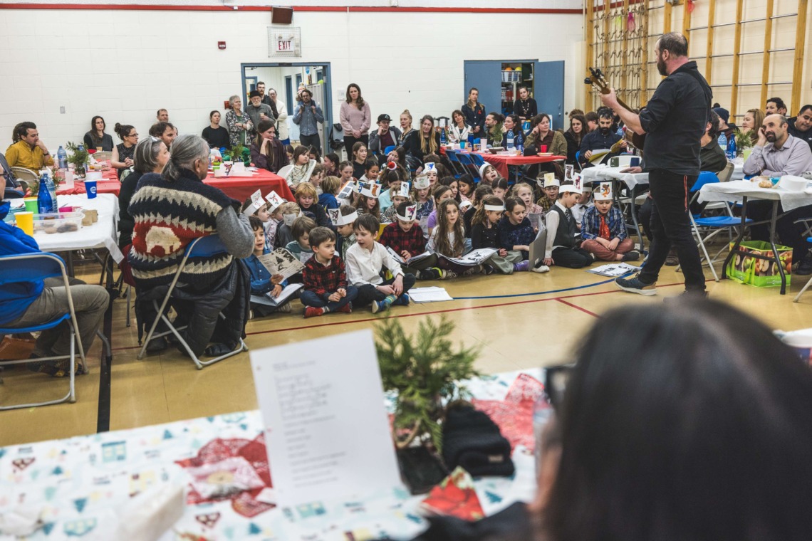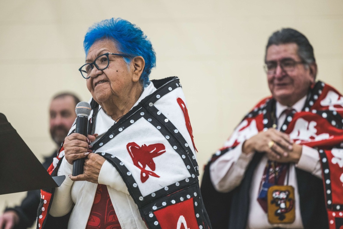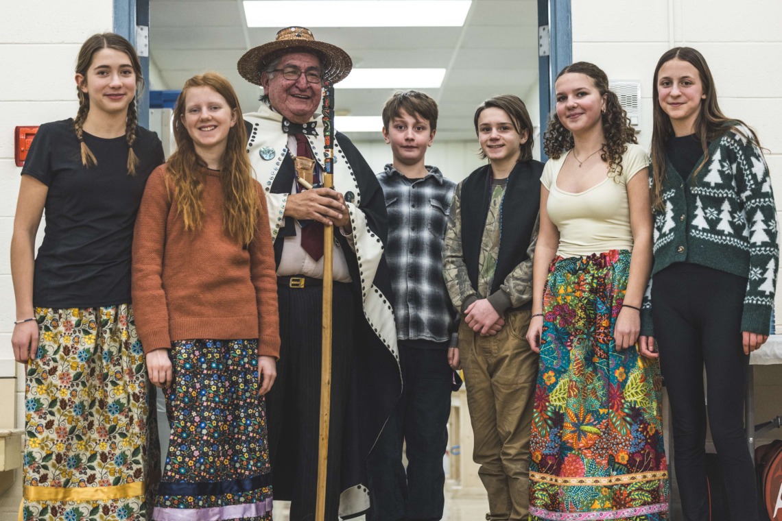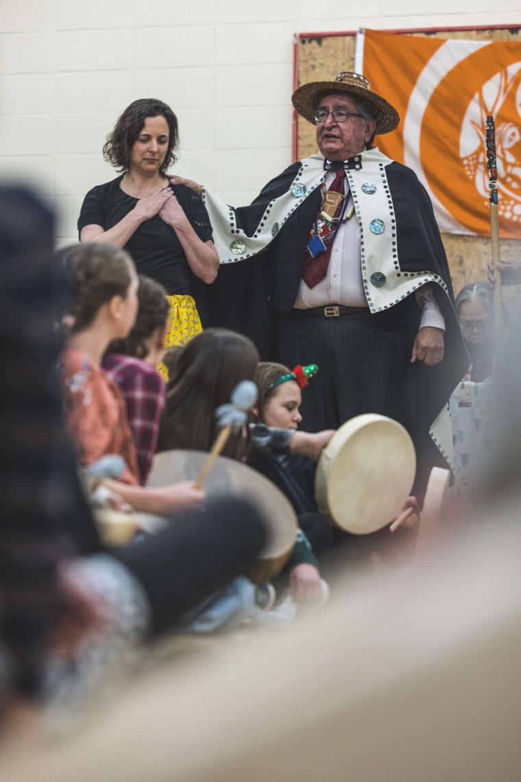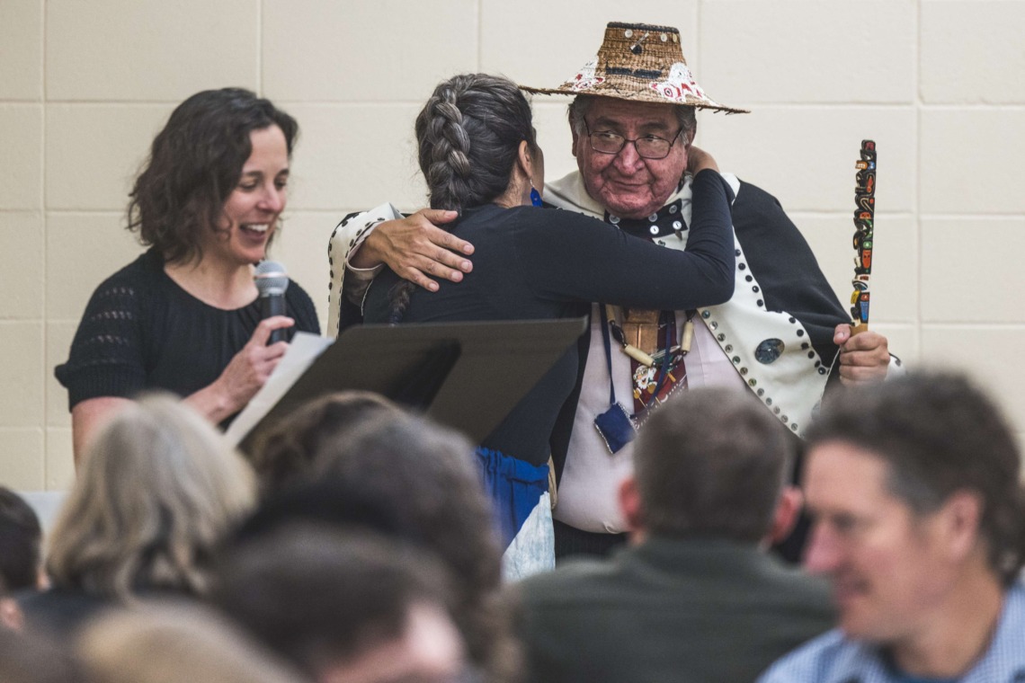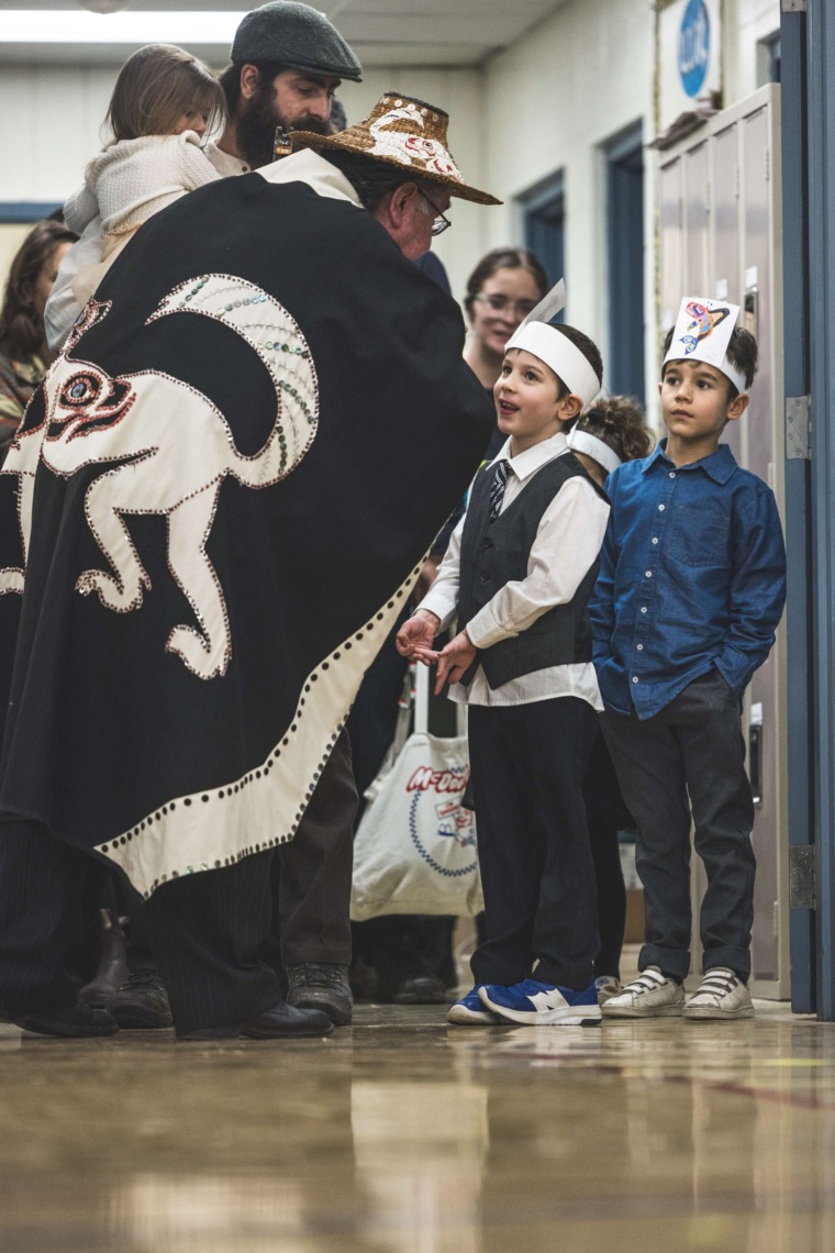 Le 11 décembre dernier, ce fut un grand honneur de recréer les traditions d’un festin et d’une cérémonie de nom d’école selon les enseignements traditionnels tsimshian dans le gymnase de l’école des Cinq-saumons. David Wells nous a généreusement accompagné dans nos apprentissages, partageant son savoir et sa culture avec notre communauté. Sa participation a été possible grâce au soutien de Angela Genaille et de son équipe de Kermode Friendship Society. Carmen Morrison a aussi apporté son soutien aux élèves dans plusieurs étapes de préparation, de la fabrication de projets d’art traditionnels en passant par l’apprentissage de chansons et la pratique de protocoles liés au déroulement d’un festin. Louisa Gray et Mary Genaille nous ont permis d’apprendre à préparer un Nisga’a stew et du pain frit. Cette célébration restera gravée dans nos coeurs comme un moment unique de partage, de connexion et d’amour. T’oyaxsut nüüsm à tous ceux qui ont contribué à cet événement; aux invités d’honneur, aux parents, aux familles, aux cuisinières, aux élèves, aux amis et aux partenaires. Merci aussi à Yan Kaczynski, photographe, pour toutes les magnifiques photos! Nous sommes honorés de dire que l’école des Cinq-saumons est maintenant Xstuunsa Hoon’m Suwilaawksat dans la langue Sm’Algyax!