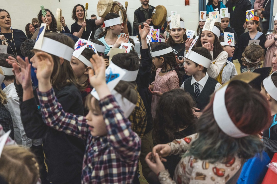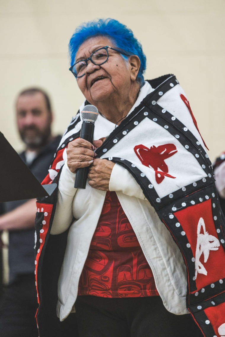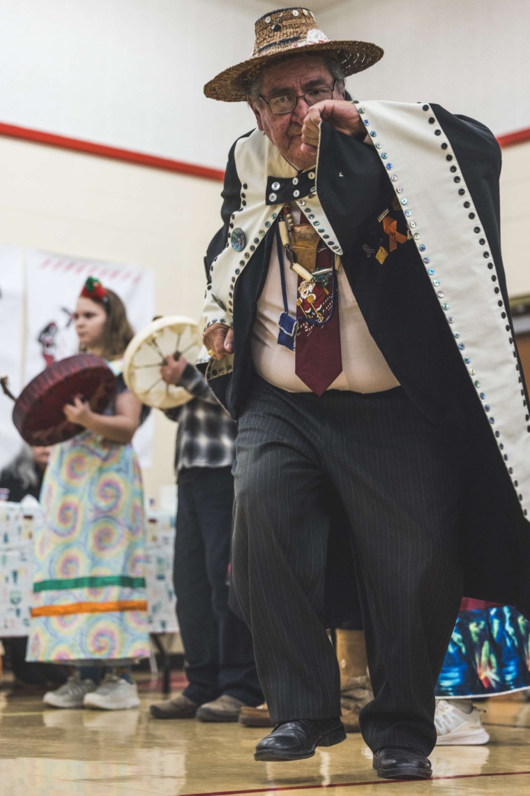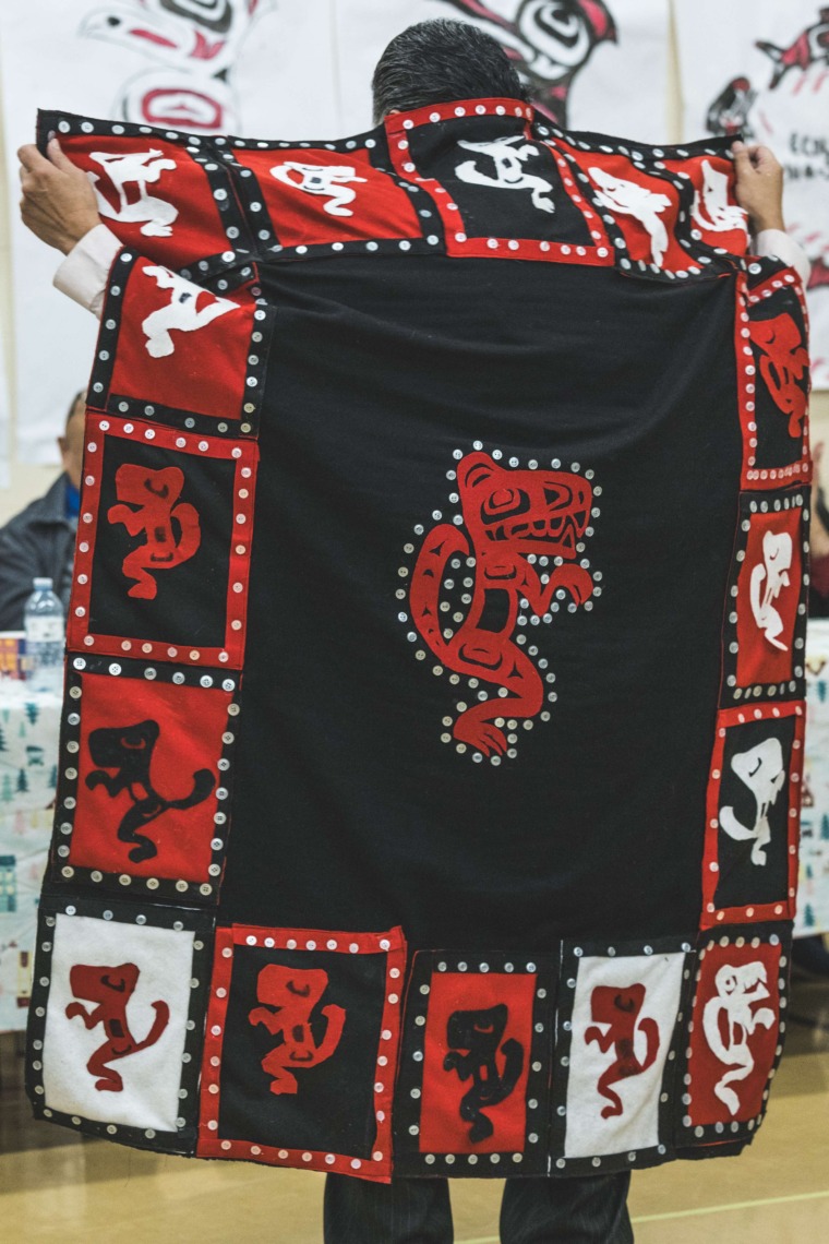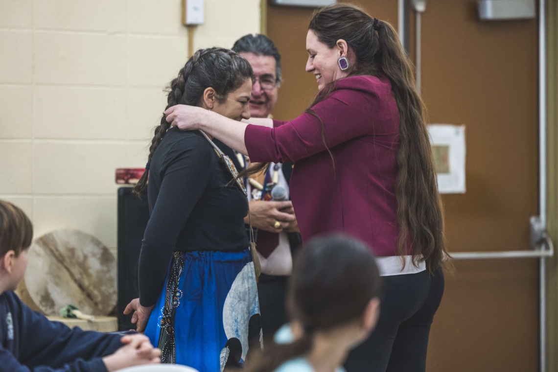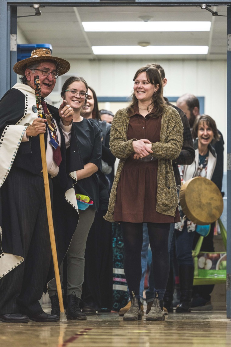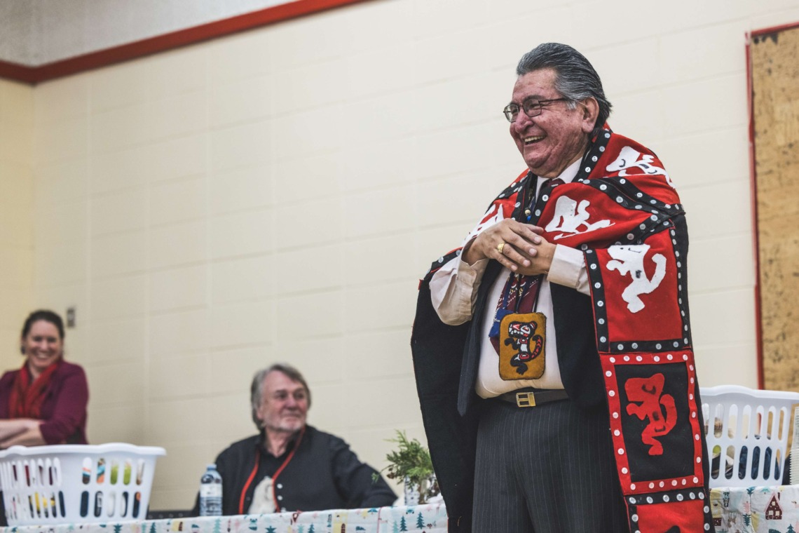 Le 11 décembre dernier, ce fut un grand honneur de recréer les traditions d’un festin et d’une cérémonie de nom d’école selon les enseignements traditionnels tsimshian dans le gymnase de l’école des Cinq-saumons. David Wells nous a généreusement accompagné dans nos apprentissages, partageant son savoir et sa culture avec notre communauté. Sa participation a été possible grâce au soutien de Angela Genaille et de son équipe de Kermode Friendship Society. Carmen Morrison a aussi apporté son soutien aux élèves dans plusieurs étapes de préparation, de la fabrication de projets d’art traditionnels en passant par l’apprentissage de chansons et la pratique de protocoles liés au déroulement d’un festin. Louisa Gray et Mary Genaille nous ont permis d’apprendre à préparer un Nisga’a stew et du pain frit. Cette célébration restera gravée dans nos coeurs comme un moment unique de partage, de connexion et d’amour. T’oyaxsut nüüsm à tous ceux qui ont contribué à cet événement; aux invités d’honneur, aux parents, aux familles, aux cuisinières, aux élèves, aux amis et aux partenaires. Merci aussi à Yan Kaczynski, photographe, pour toutes les magnifiques photos! Nous sommes honorés de dire que l’école des Cinq-saumons est maintenant Xstuunsa Hoon’m Suwilaawksat dans la langue Sm’Algyax!
